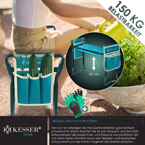 Anche il giardinaggio può richiedere più tempo, la schiena e leginocchia non devono soffrire in nessun caso. Con lo sgabello da giardino di alta qualità di KESSER ora c’è un sollievo, perché grazie al cuscino elastico e flessibile in schiuma EVA che permette di inginocchiarsi o sedersi si stasuper comodi. Con una capacità di carico massima di 150Kg sono ben protetti da pavimenti duri e superfici irregolari. Le vostre ginocchia vi ringrazieranno!