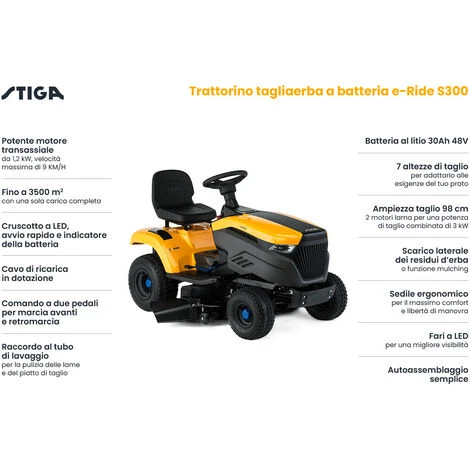 STIGA e-Ride S300 è un trattorino tagliaerba alimentato da una batteria 48 V e 30 Ah sviluppata e testata da STIGA in Italia, offre le stesse prestazioni di un trattorino da giardino a scoppio ma con rumore ridotto e zero emissioni. Questa potente batteria garantisce sessioni di lavoro fino a 45 minuti e grazie al suo ampio piatto di taglio da 98cm permette di lavorare su aree fino a 3500 m2 con una sola ricarica.