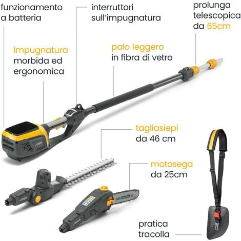 STIGA MT 500e è un attrezzo multifunzione leggero ma potente alimentato a batteria, equipaggiato con asta telescopica, accessorio da potatura e tagliasiepi, per poter raggiungere anche i cespugli e gli alberi più alti.