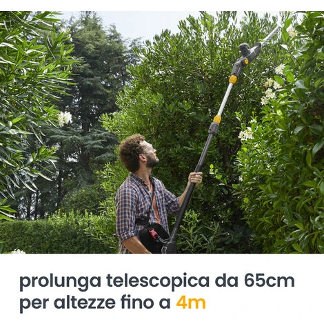 Dotato di una resistente lama a doppia azione da 46 cm tagliata al laser e da una barra di taglio da 25 cm, è in grado di affrontare senza problemi le siepi del tuo giardino. Per raggiungere i rami più alti, l’MT 500 è equipaggiato con un’asta telescopica da 65 cm, che ti permette di raggiungere siepi fino a 4,3m con l’accessorio tagliasiepi e rami fino a 4 m d’altezza con l’accessorio da potatura. Inoltre, la testina di taglio rotante fino a 112° in sei diverse posizioni permette di ottenere sempre l’angolazione di lavoro più confortevole